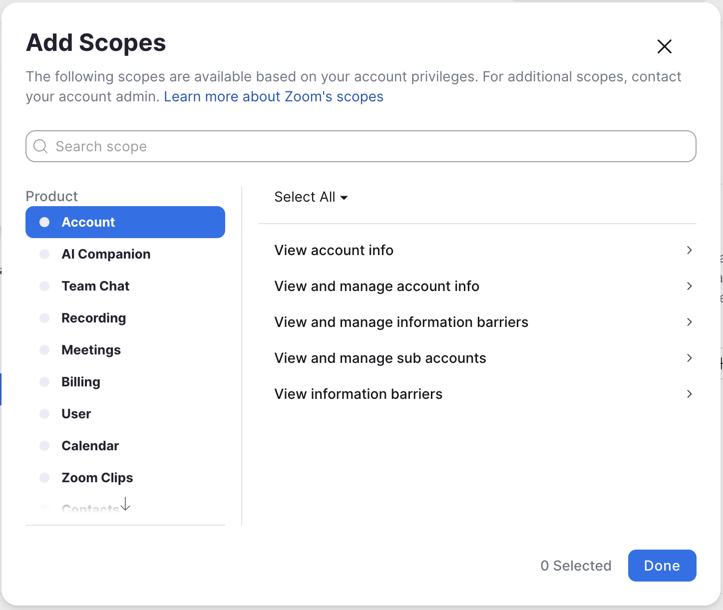 A scope-ok megadásához kattintsunk a "+ Add Scopes" gombra, amelyet követően megjelenik egy felugró ablak: