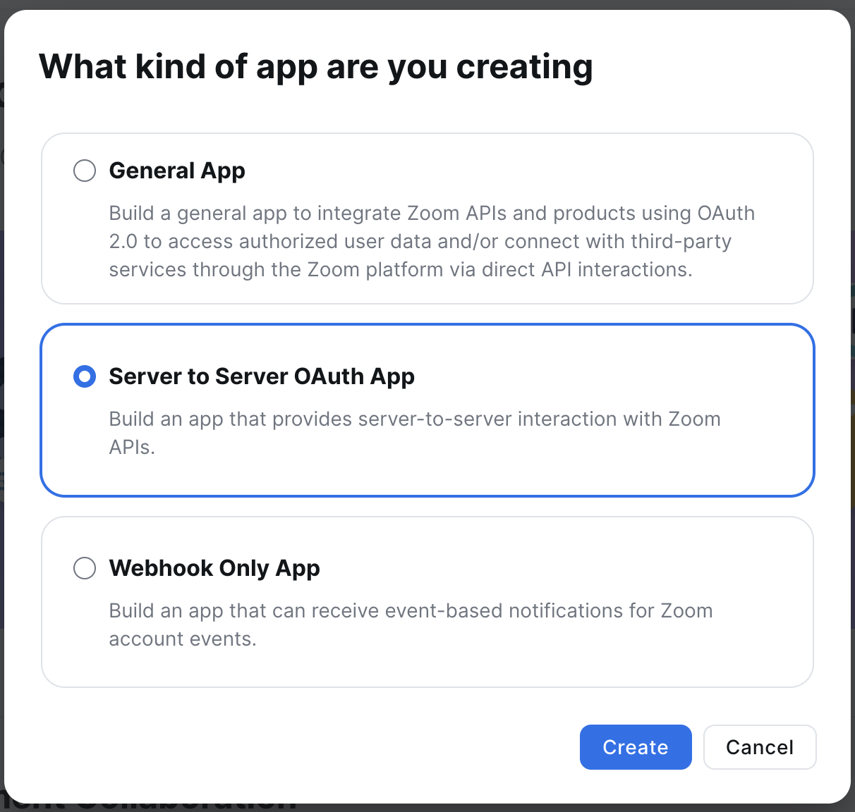 Az ezt követően megjelenő felugró ablakban válasszuk ki a „Server to Server OAuth App" opciót: