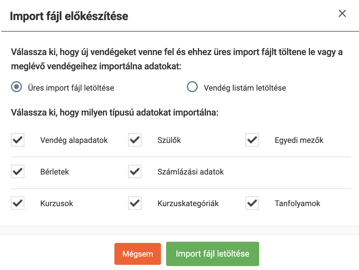- A megjelenő ablakban válaszd az “Üres import fájl letöltése” lehetőséget, majd csak azokban a mezőkben hagyd bent a pipát, amely adatokat fel szeretnéd vinni:
