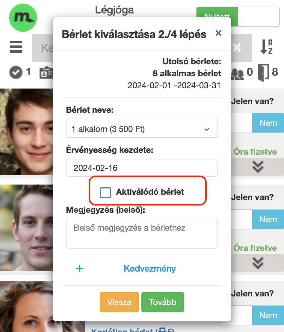 Ha a fenti gomb be van állítva, akkor a bérletek értékesítése során megjelenik az “Aktiválódó bérlet” gomb, ennek bepipálásával lehet beállítani, hogy az érvényesség az első órán való részvételkor aktiválódjon.