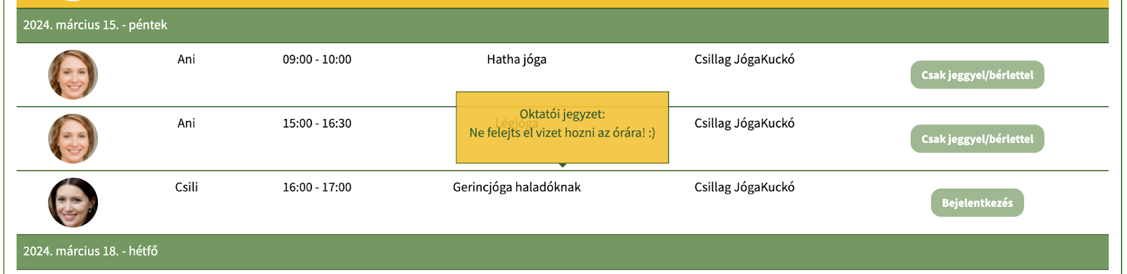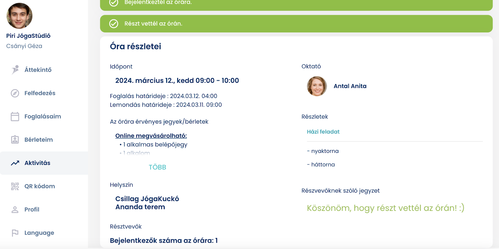 A csak résztvevők számára hozzáadott jegyzetek a vendégek fiókjában az “Aktivitás” menüben a megfelelő óránál a “Részletek” gombra kattintva fognak megjelenni a részvétel rögzítését követően.