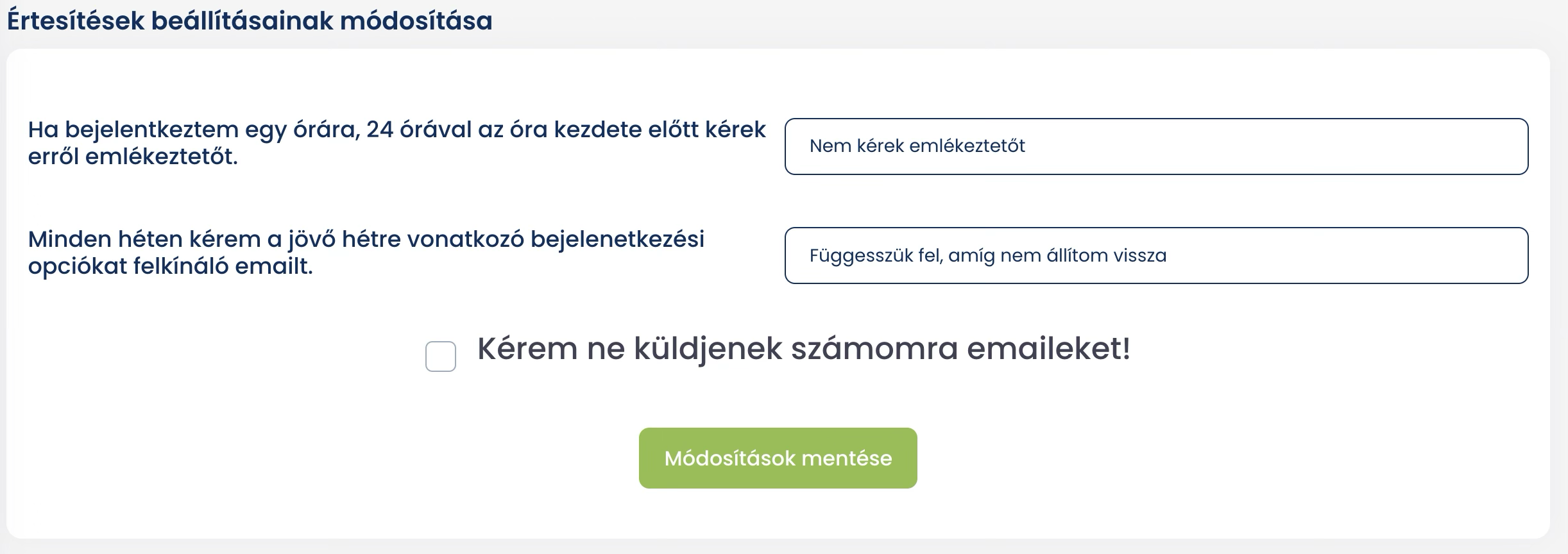 Amennyiben csak a heti kedvcsináló és az óra előtti emlékeztető üzeneteket szeretné letiltani, akkor a következő lehetőségek mellett válassza ki a legördülő listából a számára megfelelő opciót: