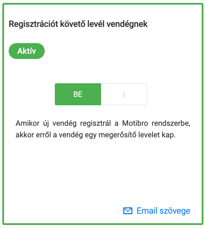 Opcionálisan beállítható, hogy amikor új vendég regisztrál a Motibro rendszerbe, akkor erről a vendég egy megerősítő levelet kapjon.