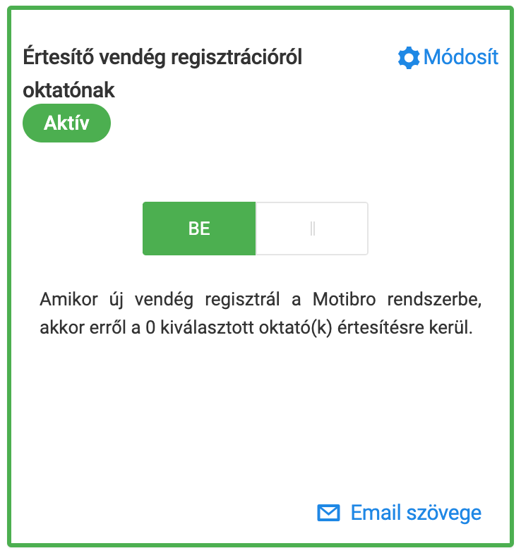 Az “Értesítő vendég regisztrációról oktatónak” egy automatikusan elküldött értesítés a kiválasztott oktatóknak arról, hogy egy új vendég/sportoló az adott klubhoz regisztrált a Motibro rendszerbe.