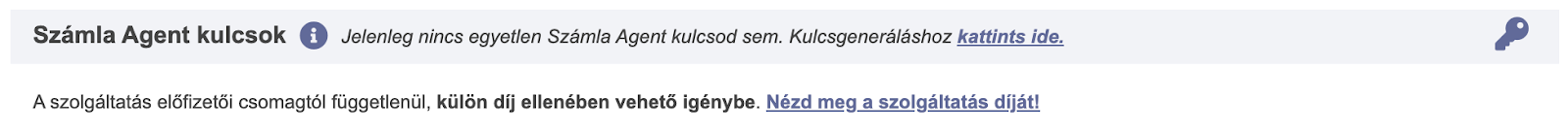 Az API kulcs részt a Számlázz.hu fiókodba való belépés után a vezérlőpult alján, a felhasználók alatti blokkban találod. Itt tudsz új kulcsot generálni a kulcs ikonra kattintva.