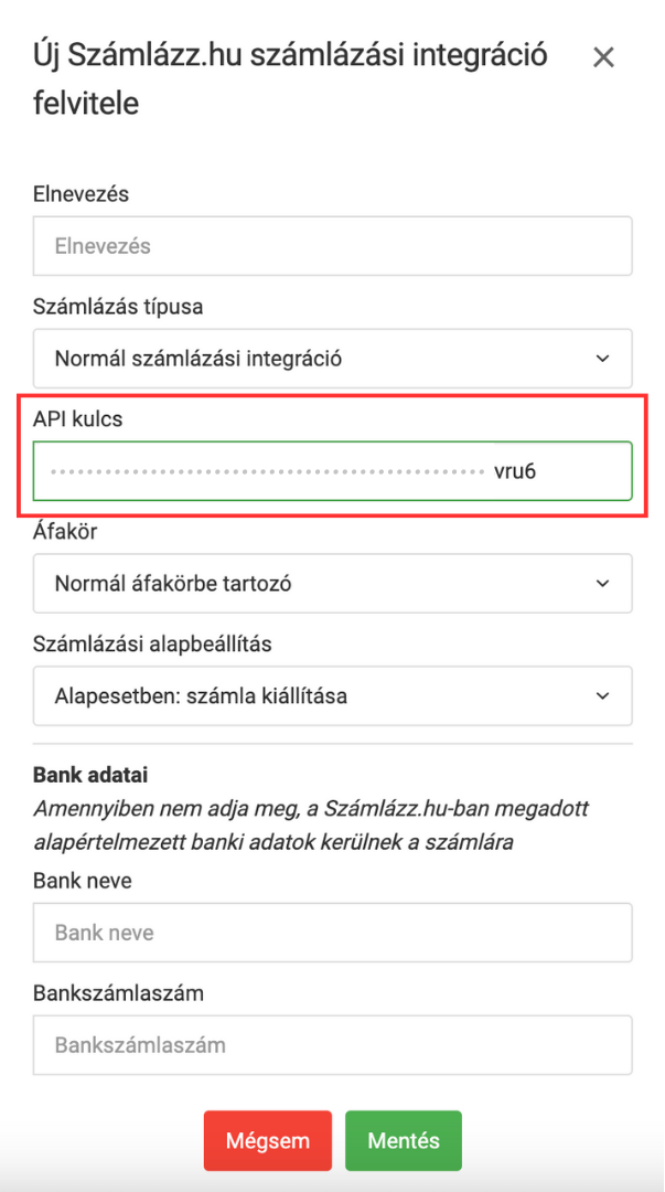 Az integrálni kívánt számlázó fiókodban létrehozott API kulcsod (lásd Számlázz.hu fiók beállítása), ezt a számlázó fiókodból másold át ide. (FIGYELEM: vigyázz a pontos másolásra!)