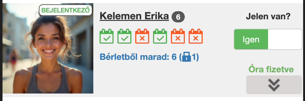 A fénykép jobb felső sarkában látható Bejelentkező felirat jelzi, hogy a vendég előzetesen bejelentkezett az adott órára. Ha nálad minden kurzustag megjelenik a jelenléti íven, akkor ez a felirat segít elkülöníteni,