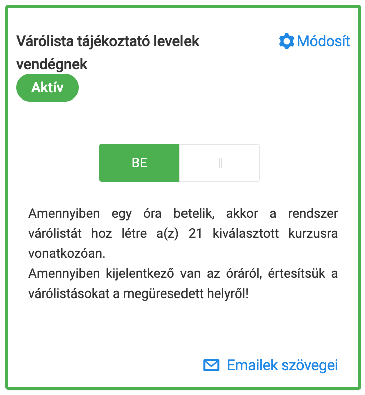 A klubvezető kurzusonként be tudja állítani, hogy az adott kurzus óráinál lehessen-e várólistára feliratkozni vagy sem.